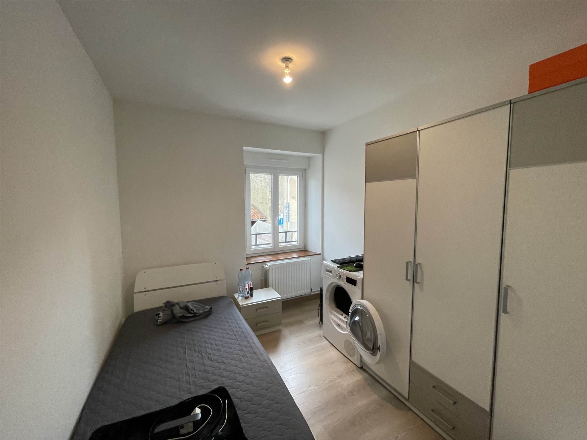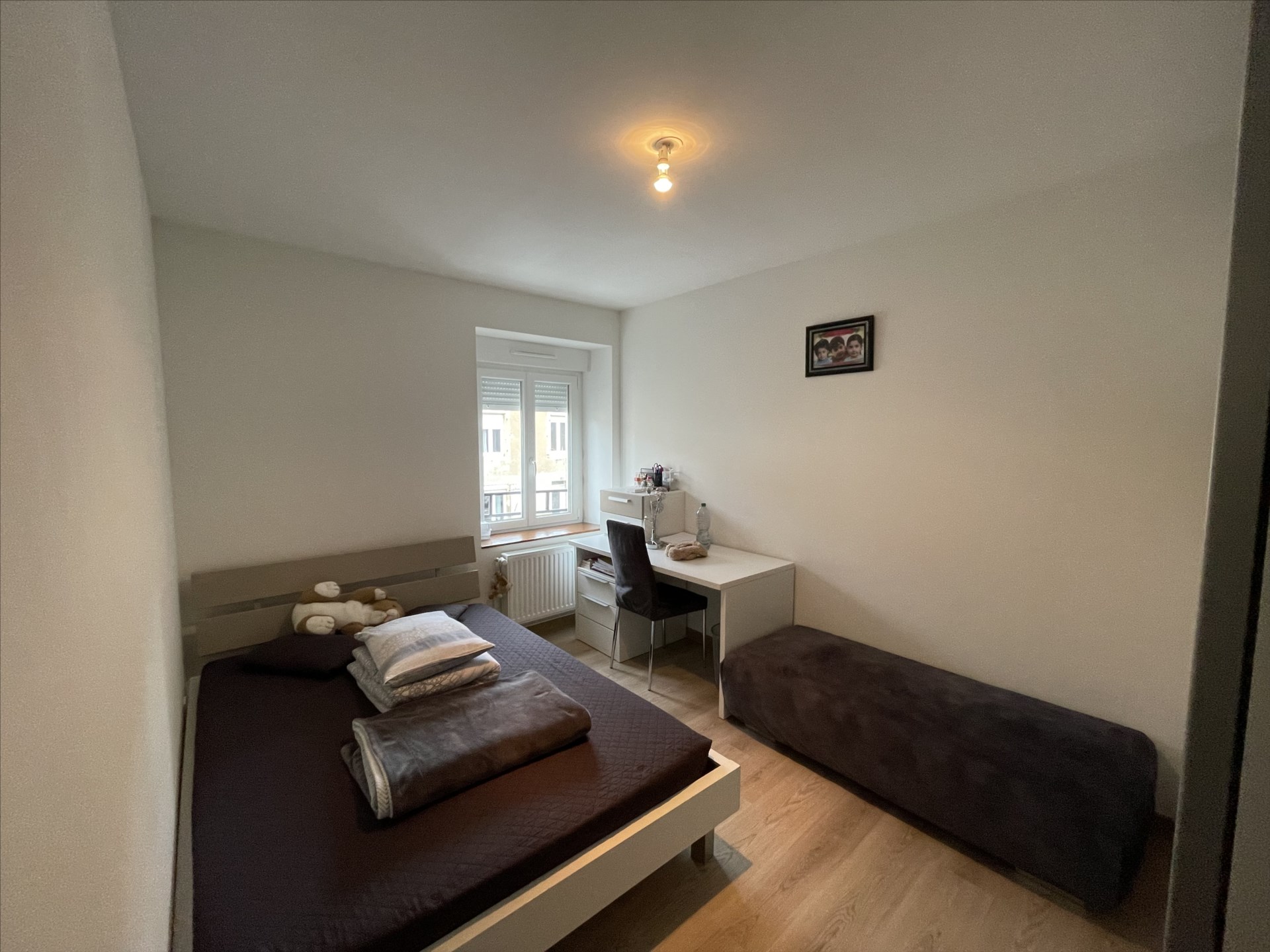 Appartement de type F4 situé au 1er étage d’un immeuble Avenue du Général de Gaulle à Courcelles-Chaussy, composé d’un salon ouvert sur une cuisine meublée, un dégagement, un cellier, deux chambres, un bureau, un wc, une salle d’eau.